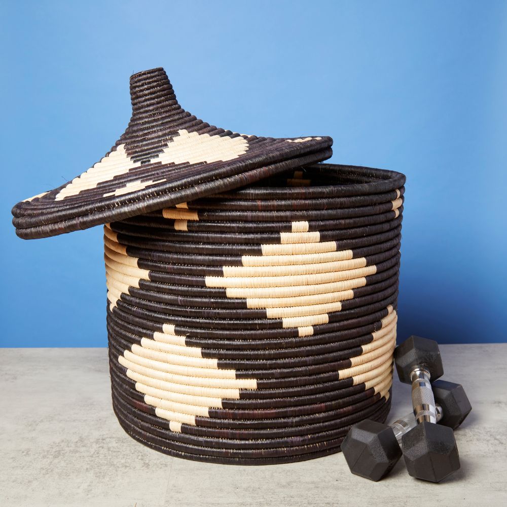 19" Small Black Diamond Woven Storage Hooded Lid Basket