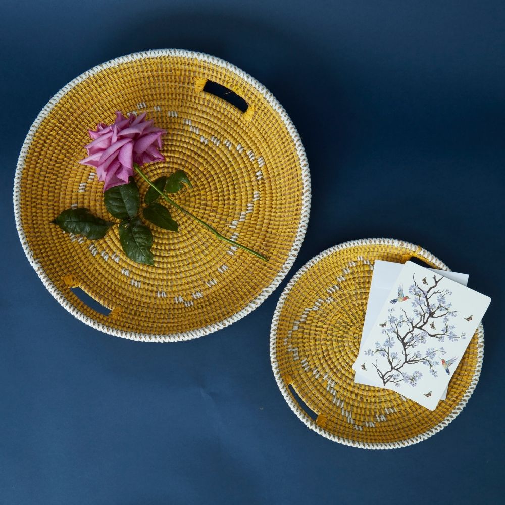 Decorative Wicker Trays, African Woven, Yellow, Round, Set of 2