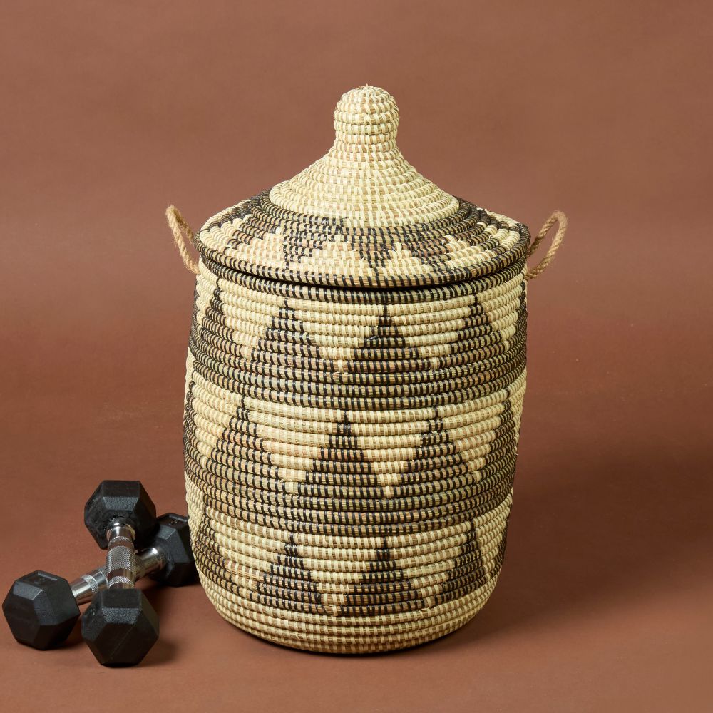 Decorative Wicker Basket with Lid & Handles, Clothes Hamper, Nursery Basket, Toy Storage, African Woven, Hood Lid, Black Triangles, Small Size